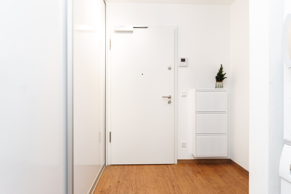 Beim Betreten der Wohnung gelangt man zunächst in eine einladende Garderobe mit ca. 6,22 m², die praktischen Stauraum bietet. Kurz vor dem Eingang zum Bad befindet sich zusätzlich eine praktische Nische mit Waschmaschinenanschluss, die Platz für Waschmaschine und Trockner bietet. Direkt angrenzend liegt das moderne Tageslichtbad mit ca. 8,90 m², das mit einer bodenebenen Dusche, einer Badewanne sowie einem Doppelwaschbecken ausgestattet ist und ein komfortables Wohlfühlambiente schafft.