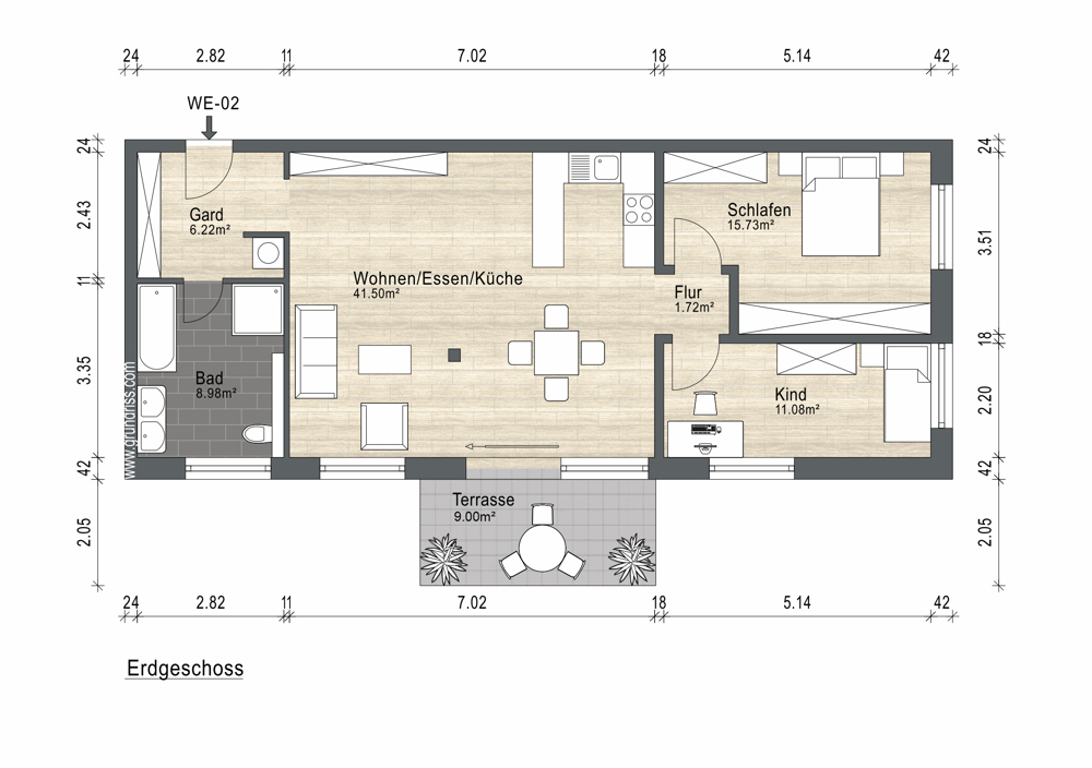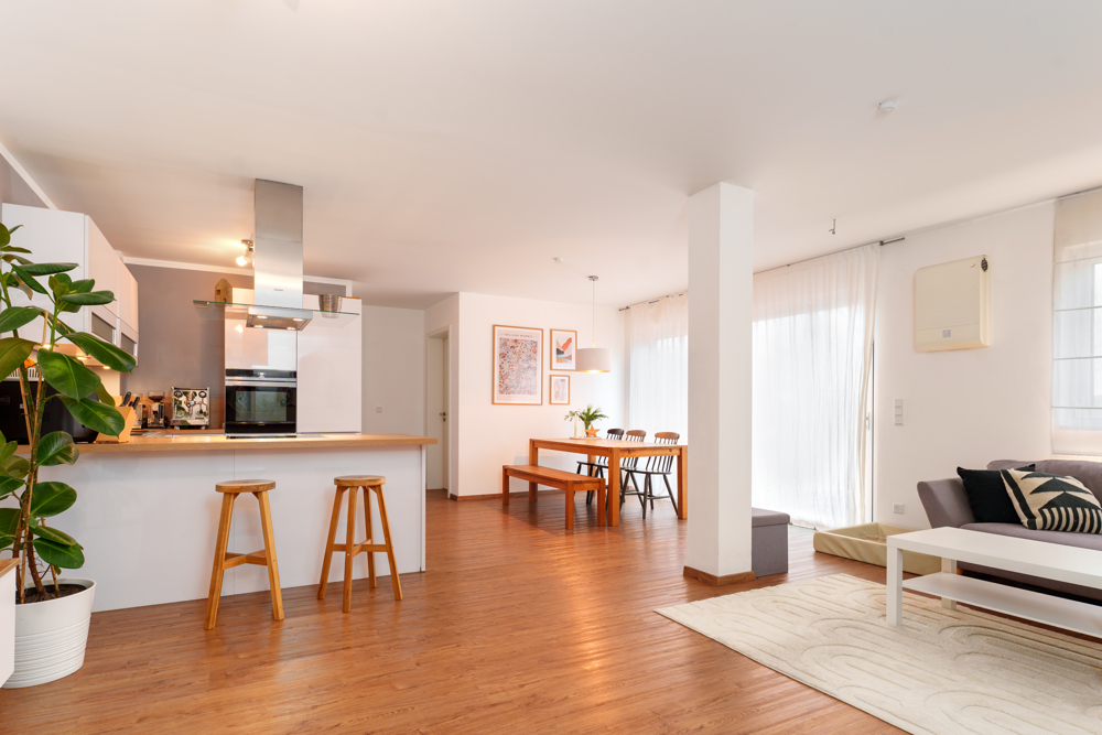 Das Highlight der Wohnung ist der großzügige und lichtdurchflutete Wohn-, Ess- und Kochbereich mit ca. 41,50 m². Große Fensterflächen öffnen den Raum zum Garten hin und sorgen für eine angenehme Wohnatmosphäre. Von hier aus gelangt man auf die sonnige Terrasse mit ca. 9,00 m² und in den eigenen Garten – perfekt für entspannte Stunden im Freien. Der private Gartenanteil umfasst zusätzlich zur Terrasse eine Fläche von ca. 93,5 m² und bietet vielfältige Gestaltungsmöglichkeiten. Die moderne Einbauküche ist bereits im Kaufpreis enthalten und fügt sich harmonisch in den offenen Wohnbereich ein.