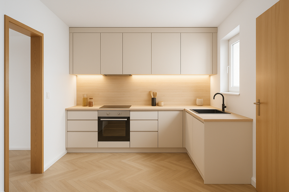 Die Küche mit ca. 11,41 m² grenzt an den Wohnbereich an und bietet viel Freiraum für eine moderne Küchenplanung nach individuellem Stil. Hier kann ein neuer Mittelpunkt für Genuss und Gemeinschaft entstehen.