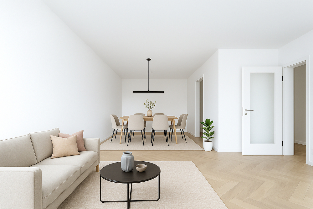 Der großzügige Wohn- und Essbereich mit ca. 29,29 m² bildet das Herzstück der Wohnung. Die großen Fenster lassen viel Tageslicht herein und schaffen ein einladendes Ambiente. Von hier aus gelangen Sie auf die überdachte Loggia mit ca. 4,26 m² – ein geschützter Ort zum Abschalten und Auftanken.