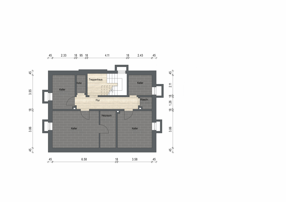 Das Untergeschoss ist über einen länglichen Flur erschlossen, von dem aus alle Räume erreichbar sind.