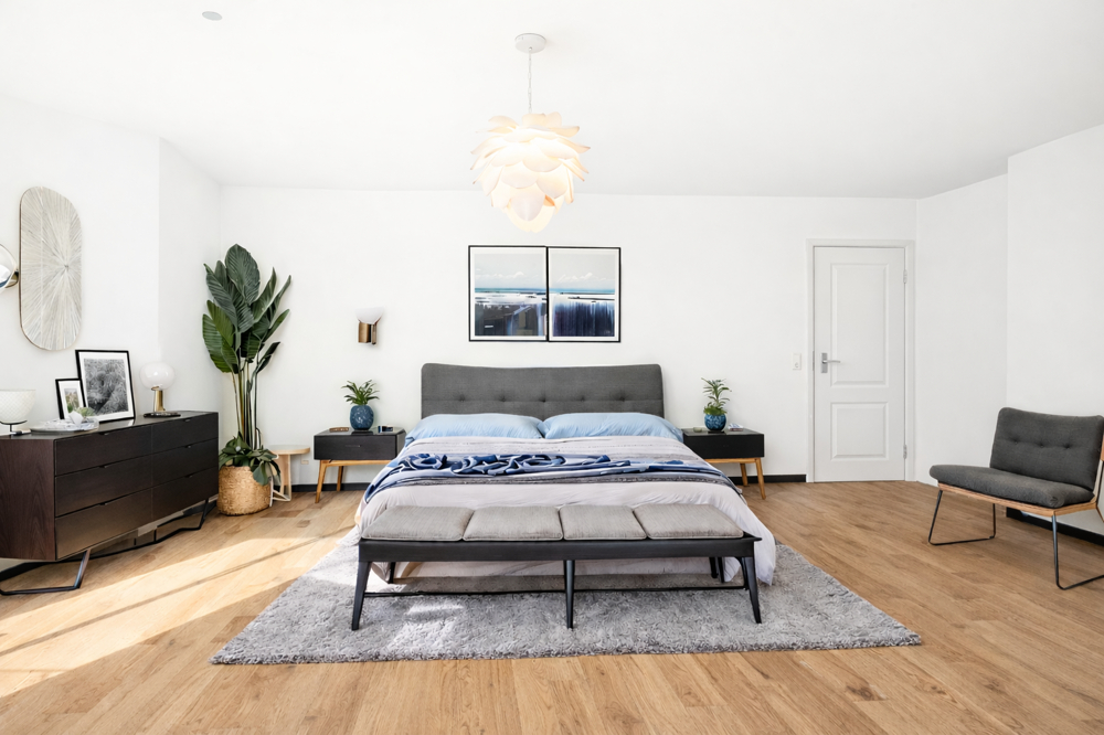 Über einen kleinen Flur erreichen Sie das großzügig geschnittene Schlafzimmer mit ca. 27,71 m², das viel Raum für unterschiedliche Möblierungswünsche bietet und zudem einen direkten Zugang zur Loggia mit ca. 10,18 m² ermöglicht – ideal für entspannte Stunden im Freien.