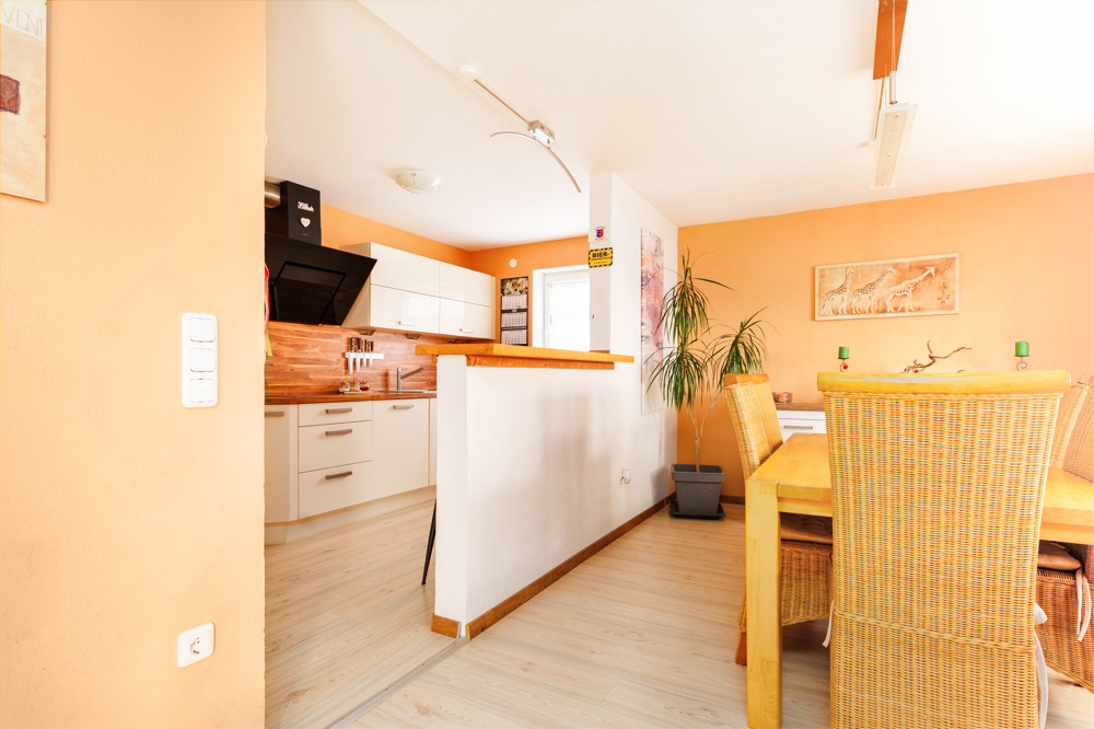 Zunächst erreichen Sie die offene Küche mit ca. 9,89 m², ausgestattet mit einer modernen Einbauküche inklusive Elektrogeräte, die bereits im Kaufpreis enthalten ist. Gleich gegenüber befindet sich die praktische Speisekammer mit ca. 3,32 m².