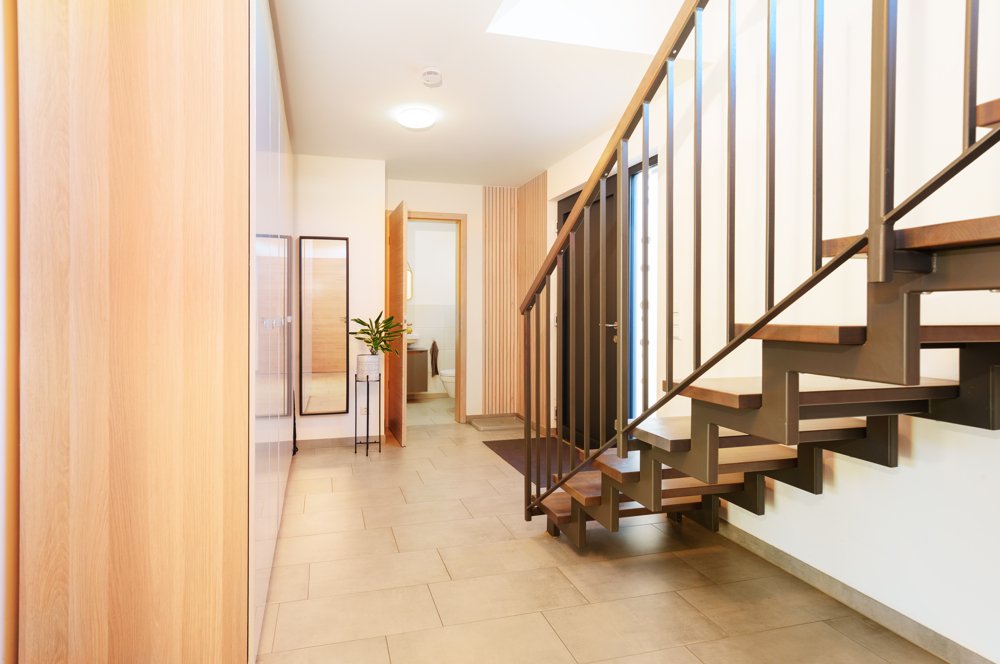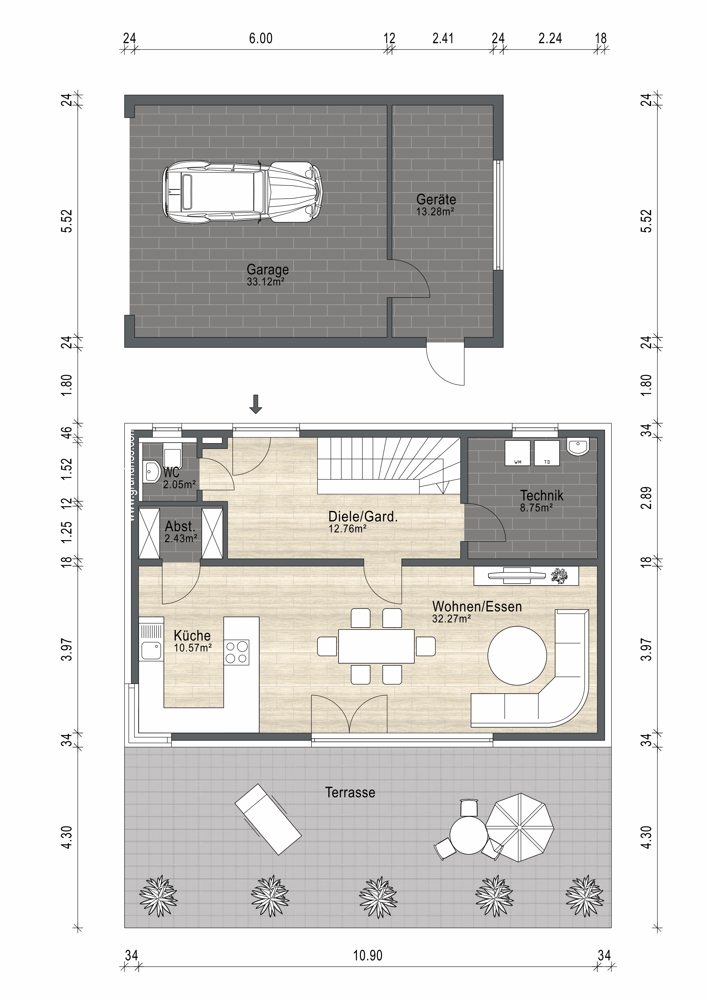 Im Erdgeschoss befinden sich zudem ein Gäste-WC mit ca. 2,05 m² sowie ein Technikraum mit rund 8,75 m². Dieser bietet nicht nur Anschlüsse für Waschmaschine und Trockner, sondern auch wertvollen Stauraum für Haushaltsutensilien und Alltägliches.
