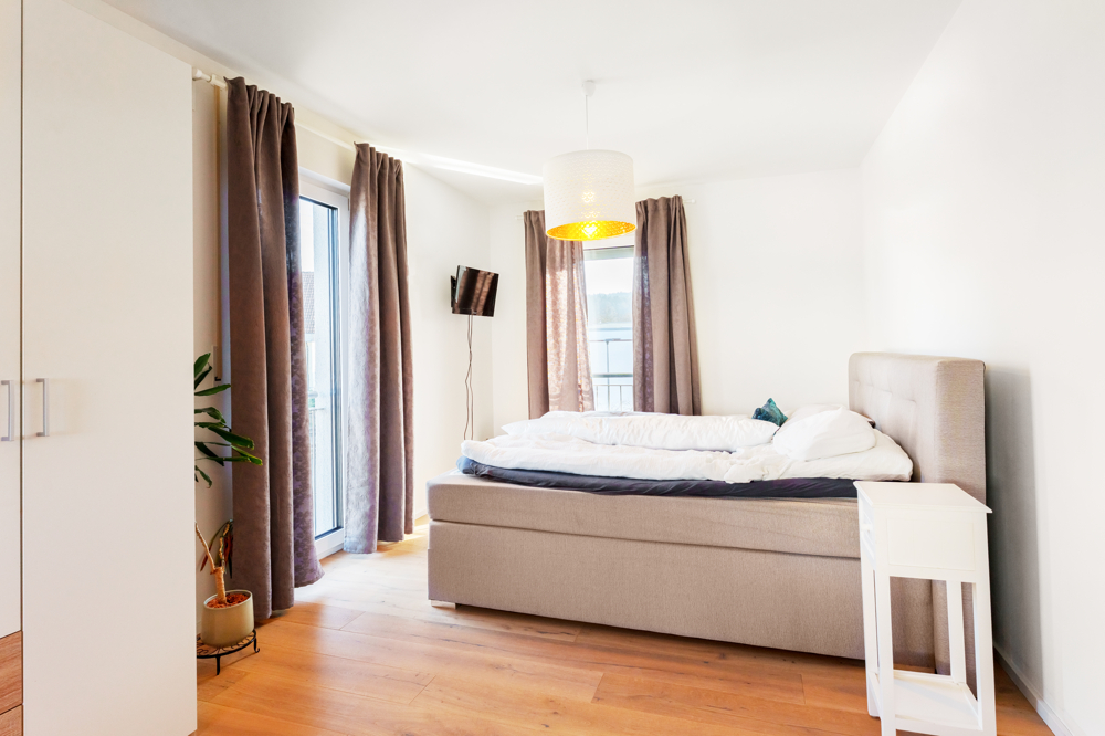 Das großzügige, länglich geschnittene Schlafzimmer mit ca. 21,30 m² bietet vielseitige Möglichkeiten der Nutzung. Durch seine Aufteilung eignet es sich perfekt, um neben dem Schlafbereich auch eine Ankleidezone oder ein kleines Homeoffice einzurichten – ideal für flexible Wohnbedürfnisse.