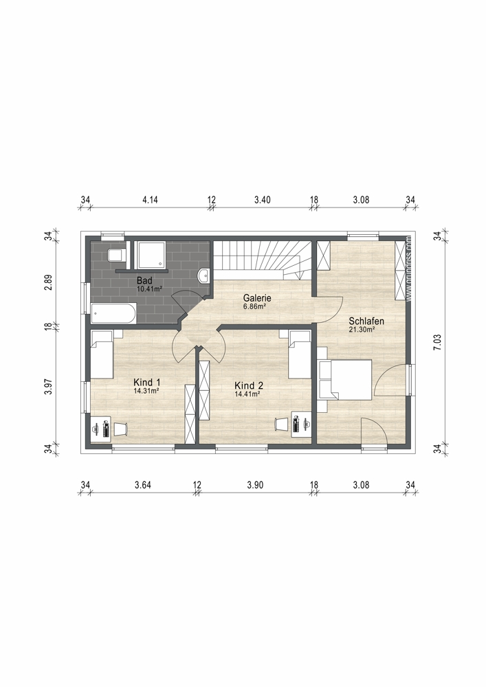 Über die Treppe gelangen Sie ins Obergeschoss, wo sich zunächst eine offene Galerie bzw. ein heller Flurbereich mit ca. 6,86 m² präsentiert. Von hier aus erschließen sich alle Räume dieser Etage.