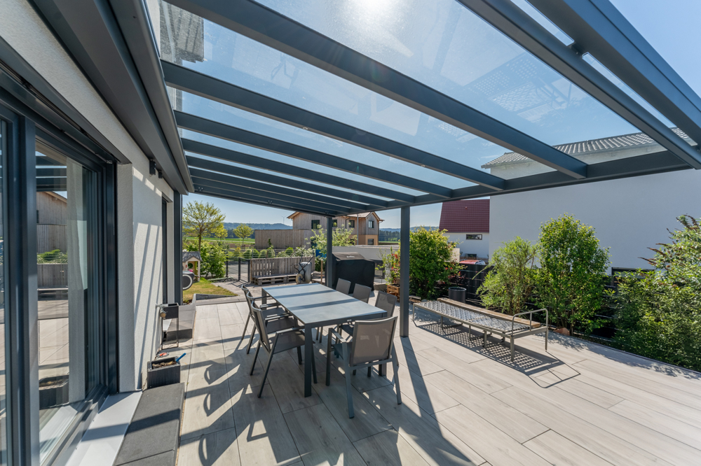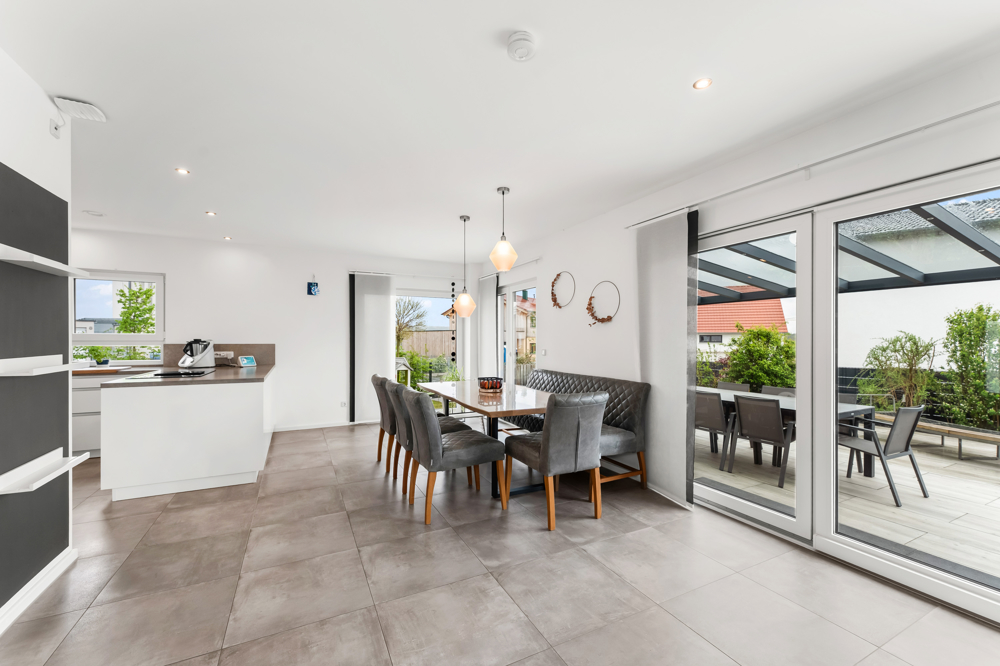 Große Fensterflächen schaffen ein helles Ambiente und ermöglichen einen direkten Zugang zur Terrasse, die teilweise überdacht ist.