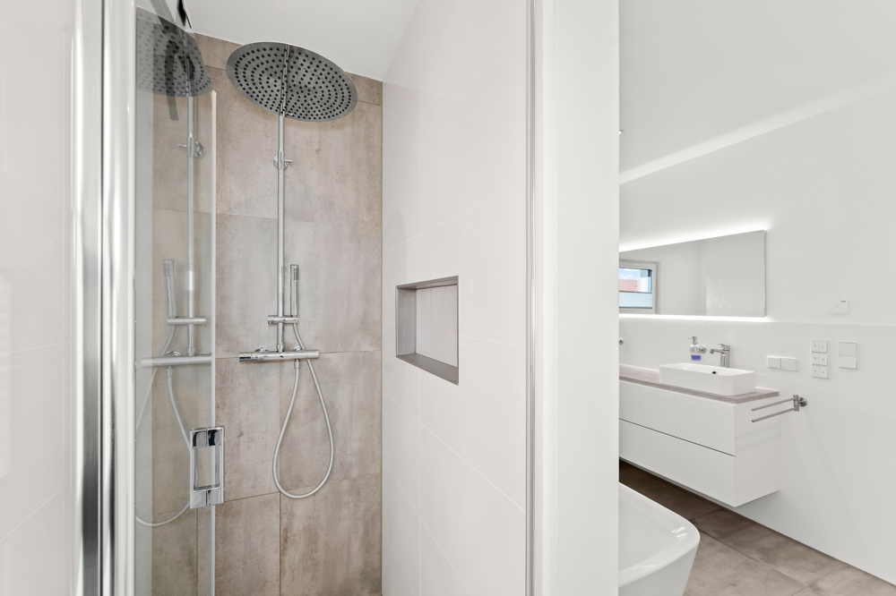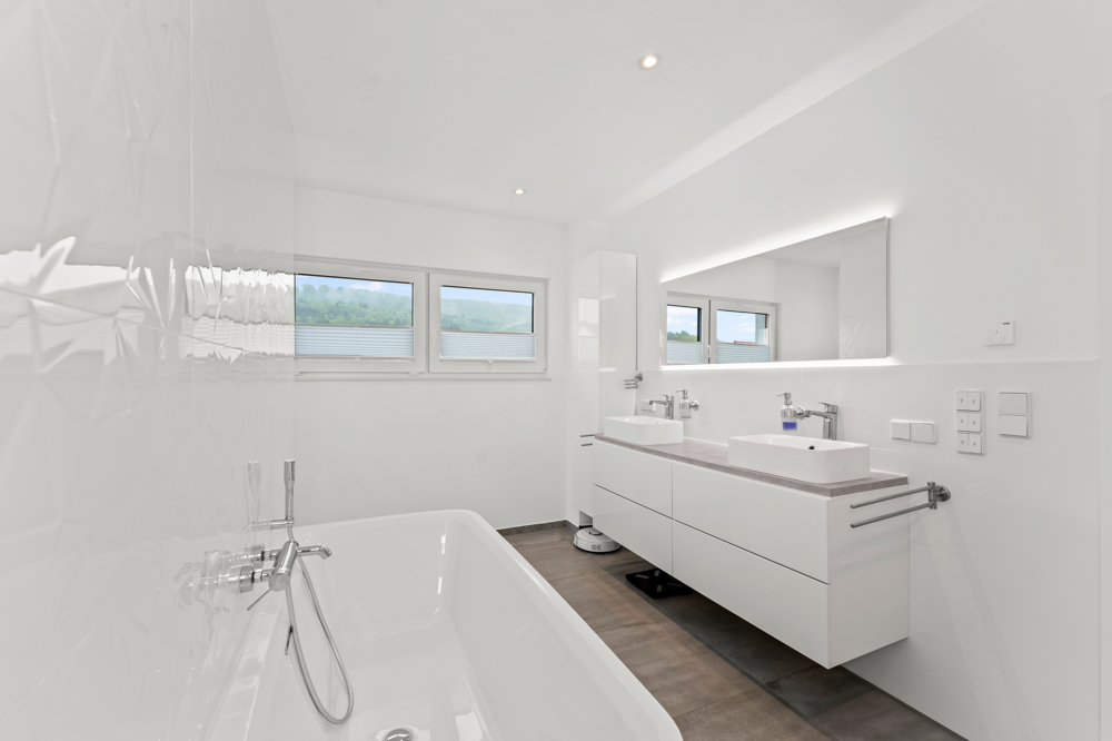 Das modern gestaltete Badezimmer mit ca. 12,12 m² rundet das Raumangebot im Obergeschoss ab: Eine stilvolle Badewanne, ein Doppelwaschbecken sowie eine separate Dusche und Toilette, geschickt hinter einer Trennwand verborgen, sorgen für ein ansprechendes und funktionales Design.
