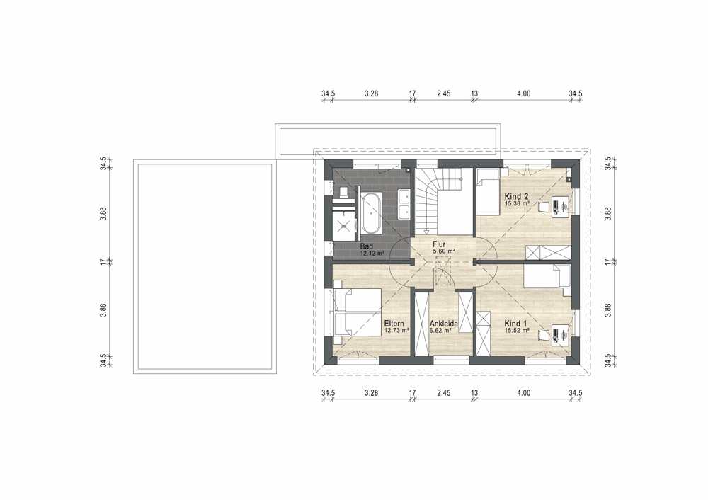 Über die Treppe gelangen Sie in das Obergeschoss, wo ein Flur mit ca. 5,60 m² die Räume verbindet. Das Elternschlafzimmer mit ca. 12,73 m² bietet eine angenehme Rückzugsmöglichkeit und wird durch ein praktisches Ankleidezimmer mit ca. 6,62 m² ergänzt, ideal für zusätzlichen Stauraum und Komfort.