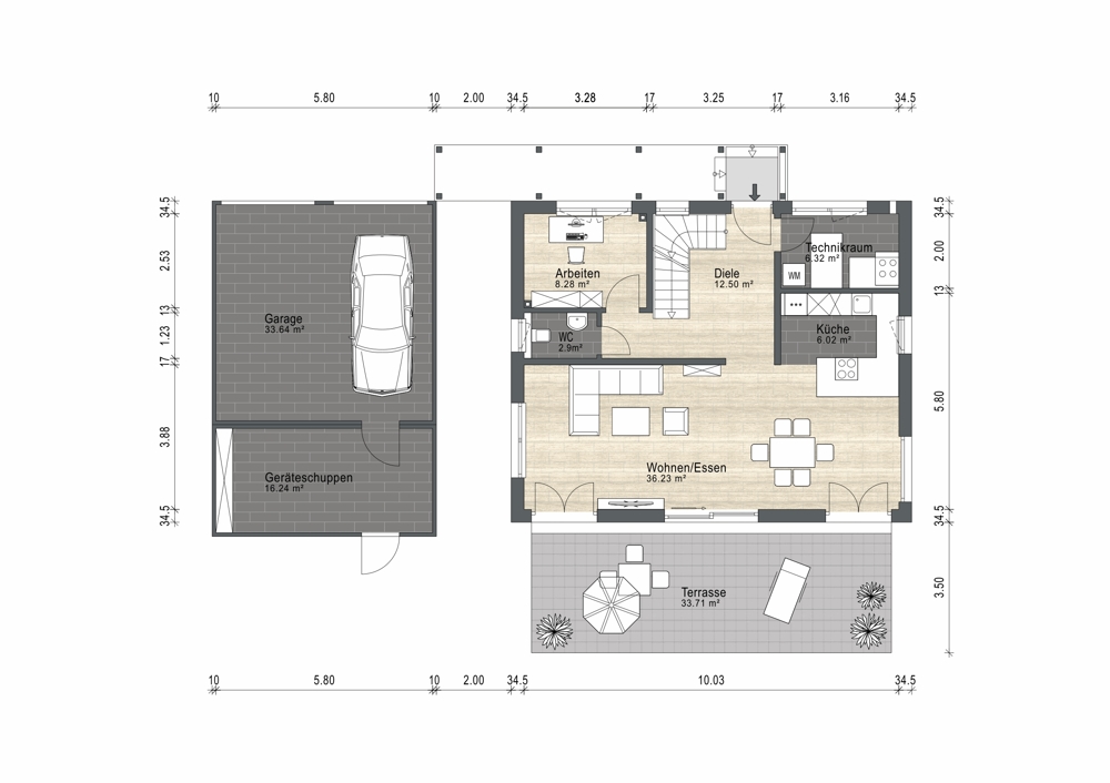 Schon beim Betreten des Hauses empfängt Sie ein offener, großzügiger Eingangsbereich mit ca. 12,50 m², der den freundlichen Charakter des Hauses sofort spürbar macht. Von hier aus erreichen Sie den lichtdurchfluteten Wohn- und Essbereich mit ca. 36,23 m², der zusammen mit der offenen Küche auf ca. 6,02 m² das Herzstück des Hauses bildet.