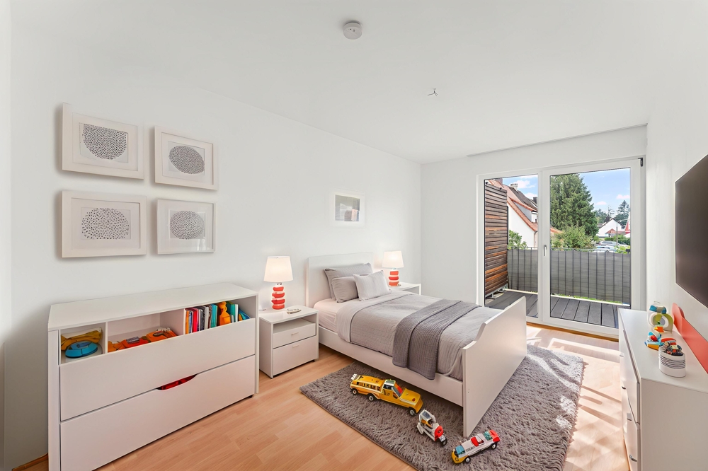 Das Schlafzimmer bietet mit ca. 12,97 m² ausreichend Platz für Ruhe und Erholung. Ergänzt wird das Raumangebot durch zwei weitere Zimmer mit ca. 13,01 m² (inklusive Zugang zum Balkon) sowie ca. 10,35 m², die sich flexibel als Kinderzimmer, Büro oder Gästezimmer nutzen lassen.