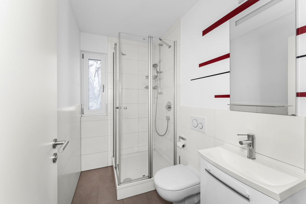 Das Badezimmer mit ca. 6,30 m² ist mit einer Badewanne sowie Anschlüssen für Waschmaschine und Trockner ausgestattet. Ein separates WC mit Dusche ist ca. 3,47 m² groß und sorgt für zusätzlichen Komfort im Alltag. Abgerundet wird das Angebot durch einen praktischen Abstellraum, der Platz für Haushaltsutensilien und Vorräte bietet.