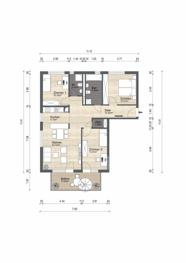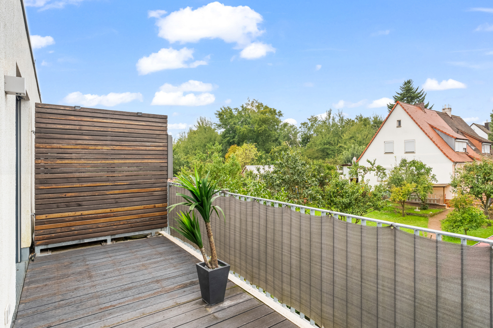 Vom Wohnbereich aus gelangen Sie direkt auf den großzügigen Balkon mit etwa 10,84 m², der zum Entspannen im Freien einlädt.
