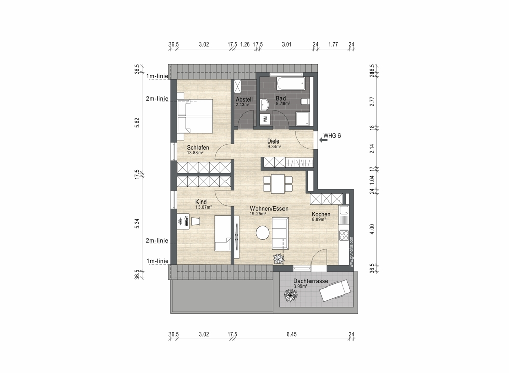 Die moderne Neubau-Wohnanlage umfasst insgesamt sechs Wohneinheiten und bietet ein harmonisches Gesamtbild in ruhiger Lage. Im Erdgeschoss befinden sich zwei Wohnungen mit jeweils einer sonnigen Terrasse, im Obergeschoss zwei weitere Einheiten mit Balkon und im Dachgeschoss zwei attraktive Wohnungen mit eigener Dachterrasse.