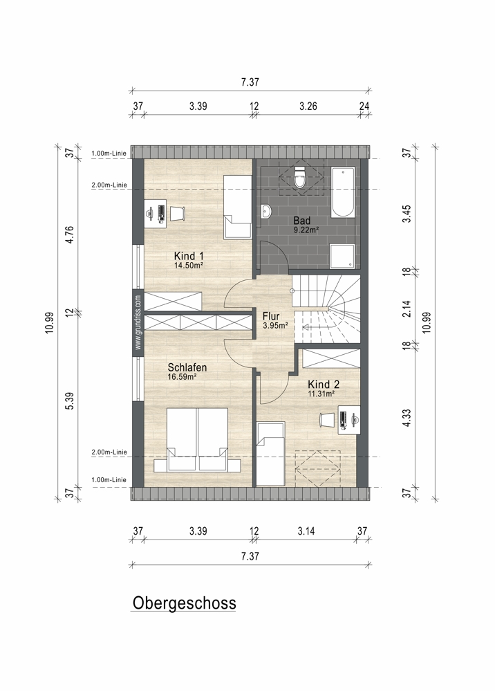 Über eine Treppe erreichen Sie das Obergeschoss, das sich mit ca. 55,94 m² perfekt für die Familie eignet. Das Elternschlafzimmer mit ca. 16,85 m² bietet ausreichend Platz und lässt sich individuell einrichten. Zwei weitere Zimmer mit ca. 14,76 m² und ca. 11,39 m² eignen sich ideal als Kinder-, Arbeits- oder Gästezimmer. Das Tageslichtbad mit ca. 9,22 m² überzeugt mit einer modernen Ausstattung: Badewanne, bodentiefer Dusche sowie einem Doppelwaschbecken – perfekt für den Familienalltag. Ein Flur mit ca. 3,73 m² verbindet die Räume harmonisch miteinander.