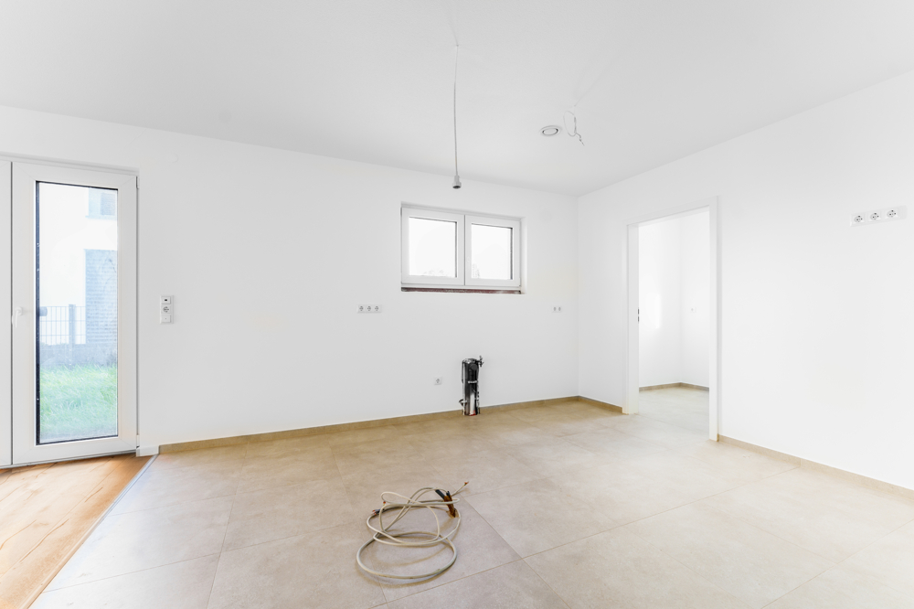 Beim Betreten der Doppelhaushälften gelangen Sie zunächst in die Diele mit ca. 4,63 m², die ausreichend Platz für eine Garderobe bietet. Von hier öffnet sich der helle und großzügige Wohn- und Essbereich mit ca. 30,30 m², der dank großer Fensterflächen ein einladendes Wohngefühl schafft und direkten Zugang zur Terrasse mit ca. 13,6 m² sowie in den Garten ermöglicht. Die angrenzende Küche mit ca. 16,39 m² bietet ideale Bedingungen für gemeinsames Kochen, während eine praktische Speisekammer mit ca. 2,87 m² zusätzlichen Stauraum schafft. Abgerundet wird das Erdgeschoss durch ein Gäste-WC mit ca. 2,28 m², sowie einen praktischen Technikraum, der ebenfalls über Tageslicht verfügt.