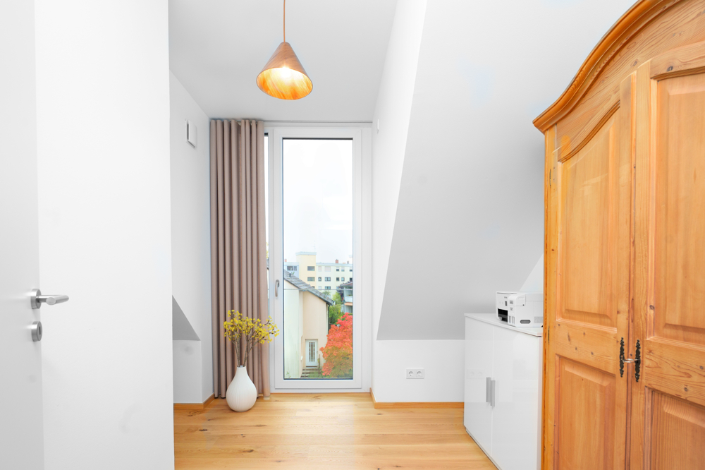 Große Fensterfronten sorgen für ein lichtdurchflutetes Ambiente und führen direkt auf die sonnige, großflächige Dachterrasse mit ca. 15,58 m² – ein Ort zum Entspannen und Genießen.