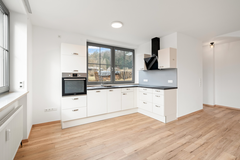 Der offen gestaltete Wohn- und Essbereich mit integrierter Küche umfasst ca. 33,27 m² und überzeugt durch seine helle, freundliche Atmosphäre. Große Fensterflächen lassen viel Tageslicht herein und schaffen ein angenehmes Raumgefühl. Hochwertige Bodenbeläge und eine stilvolle Einbauküche runden das moderne Wohnambiente ab.