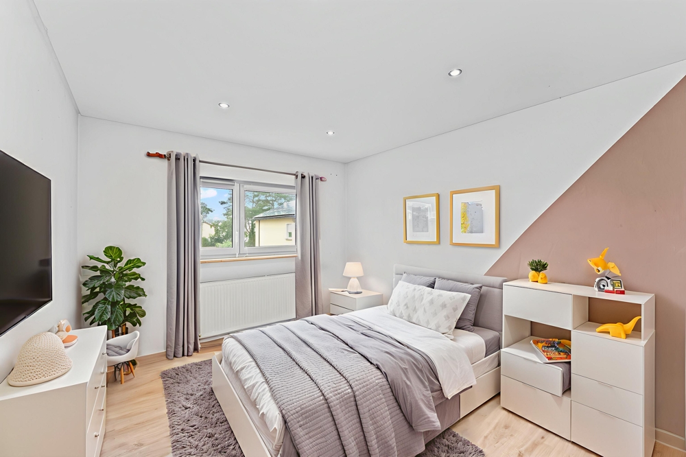 Neben dem großzügigen Elternschlafzimmer mit ca. 14,57 m² stehen Ihnen zwei Kinderzimmer mit ca. 10,66 m² und ca. 10,65 m² zur Verfügung.