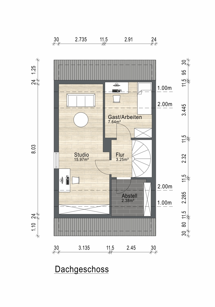 Im ausgebauten Dachgeschoss stehen Ihnen zwei weitere Zimmer zur Verfügung: Ein großzügiges Studio mit ca. 15,97 m² sowie ein weiteres Zimmer mit ca. 7,64 m², die beide flexibel als Kinder-, Gäste- oder Arbeitszimmer genutzt werden können. Ergänzt wird das Raumangebot durch einen praktischen Abstellraum mit ca. 2,38 m², der zusätzlichen Stauraum schafft.