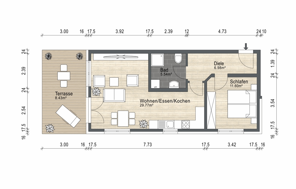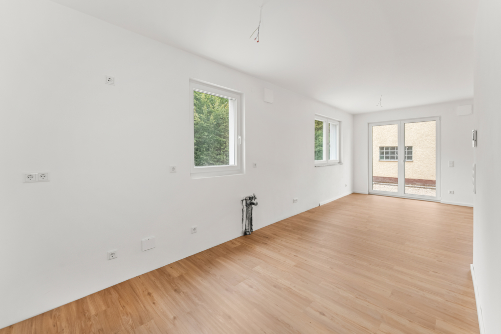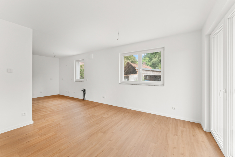 Herzstück der Wohnung ist der großzügige Wohn-, Ess- und Kochbereich mit ca. 29,77 m², der durch die offene Gestaltung und große Fensterflächen besonders hell und freundlich wirkt. Von hier aus gelangt man direkt auf die ca. 8,4 m² große Terrasse, die nach Südwesten ausgerichtet ist, perfekt für sonnige Nachmittage und laue Sommerabende im Grünen.