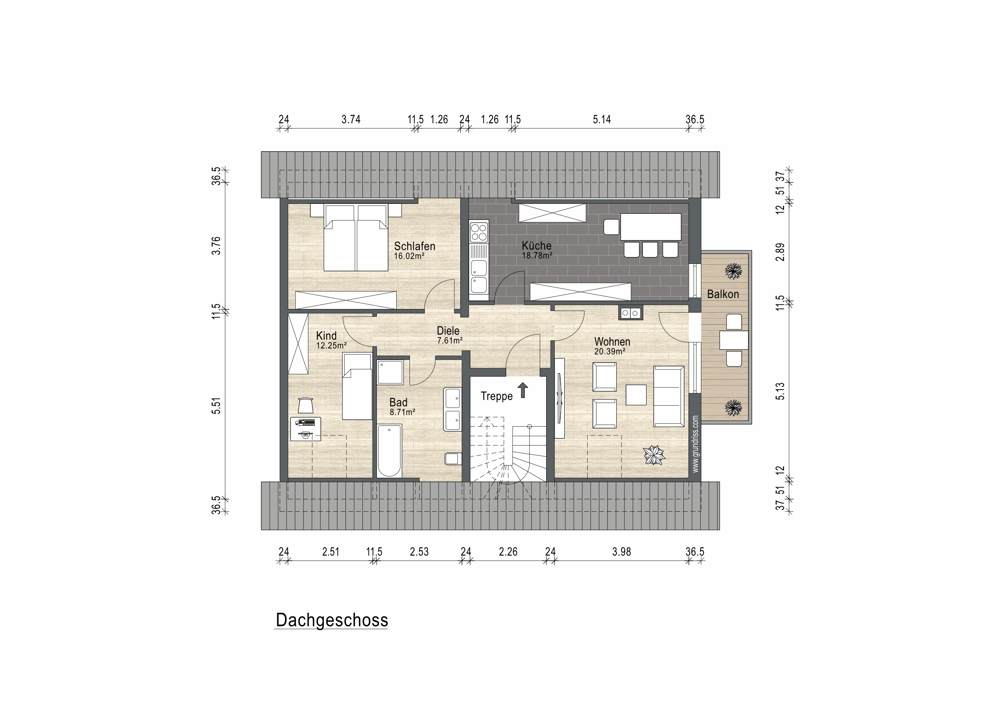 Die Dachgeschosswohnung bietet eine Wohnfläche von ca. 81 m² und ist als 3-Zimmer-Wohnung ausgeführt. Sie verfügt über ein Wohnzimmer mit ca. 20,39 m², eine großzügige Küche mit ca. 18,78 m², ein Schlafzimmer mit ca. 16,02 m² sowie ein Kinderzimmer mit ca. 12,25 m². Ein Badezimmer mit ca. 8,71 m², eine Diele sowie ein Balkon runden das Raumangebot ab.