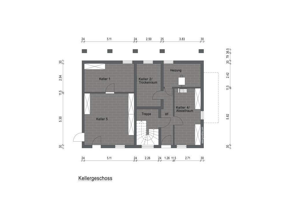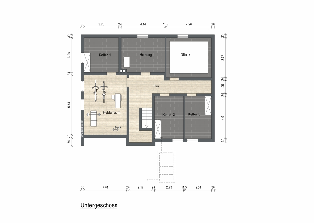 Das Gebäude ist vollständig unterkellert. Im Untergeschoss befinden sich ein Heizraum, ein Trockenraum sowie drei weitere Kellerräume, die zusätzlichen Stauraum bieten.