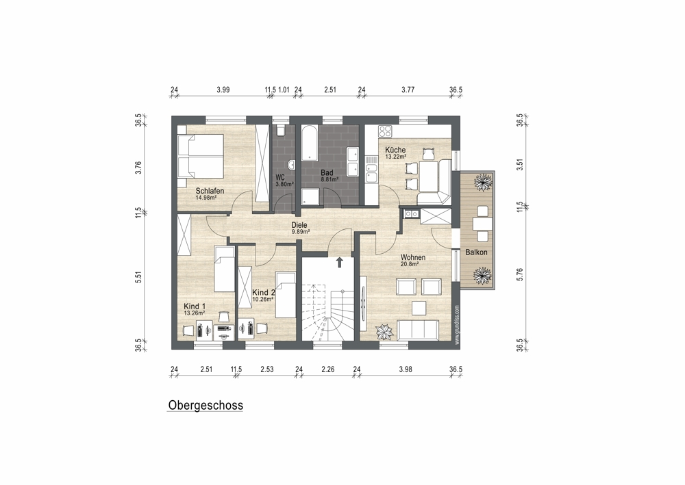 Die Grundrisse dieser beiden Wohnungen umfassen ein Wohnzimmer mit ca. 20,8 m², eine Küche mit ca. 13,22 m², ein Schlafzimmer mit ca. 14,98 m² sowie zwei Kinderzimmer mit ca. 13,26 m² und ca. 10,26 m². Ergänzt wird das Raumangebot durch ein Badezimmer mit ca. 8,81 m², ein separates WC sowie eine zentrale Diele. Beide Wohnungen verfügen zudem über einen Balkon.